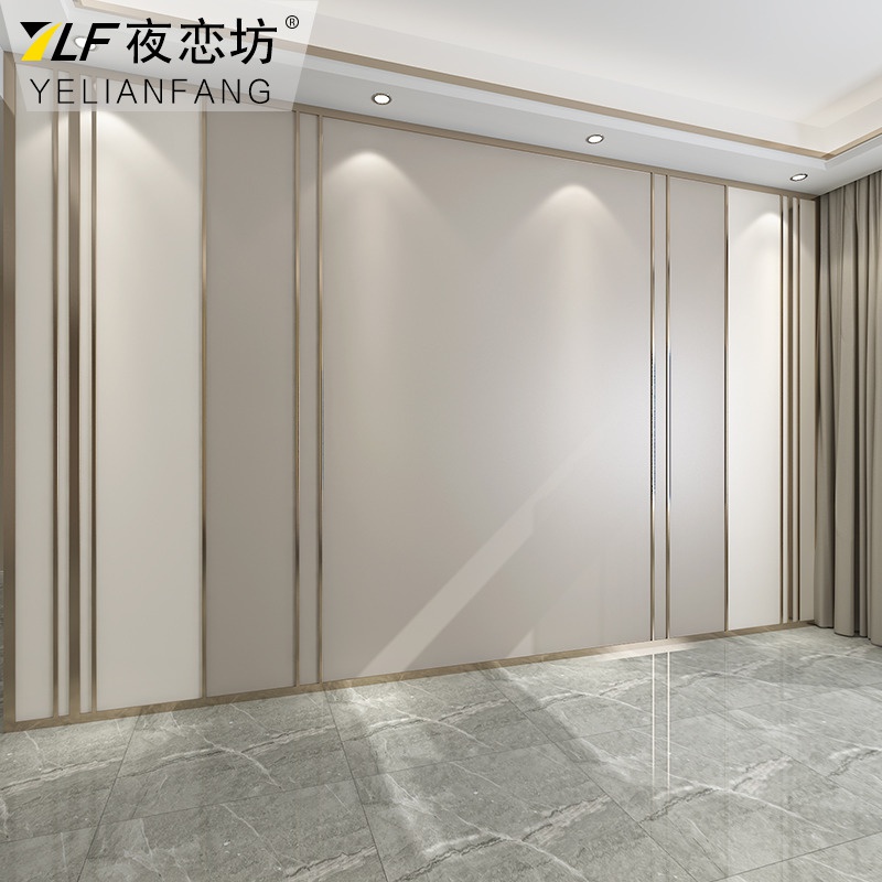 。现代轻奢硬包电视背景墙客厅皮革金属条沙发影视装饰卧室床头。热门设计联盟服务商